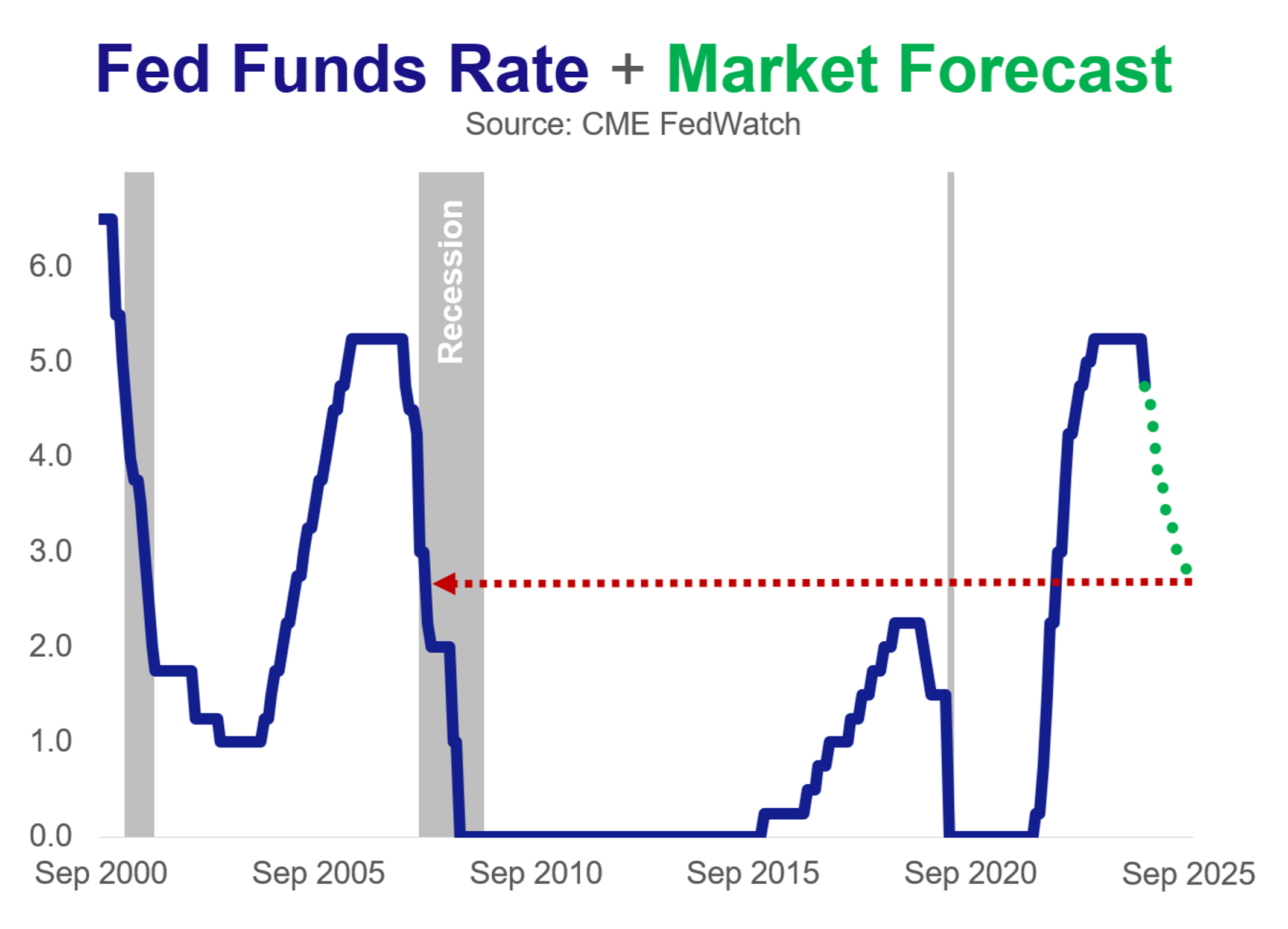 So where to from here? The market expects that by this time next year, the Fed will have cut interest rates 10 times and taken its benchmark rate from 5.25% to about 2.75%. That is a significant easing of monetary policy any way you cut it. But unlike other recent cutting cycles that took interest rates down an elevator shaft to zero, a “soft landing” does not require hyper-aggressive rate cuts to “save” the economy (like 2008 or 2020). Based on the Fed’s own projections, rates would settle to around 3% when all is said and done. That would be much lower than today’s rate but higher than at any time from 2009 to 2021.