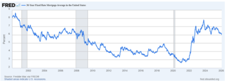 1 Federal Reserve Bank of St. Louis. 2026. “30-Year Fixed Rate Mortgage Average in the United States.” https://fred.stlouisfed.org/series/MORTGAGE30US